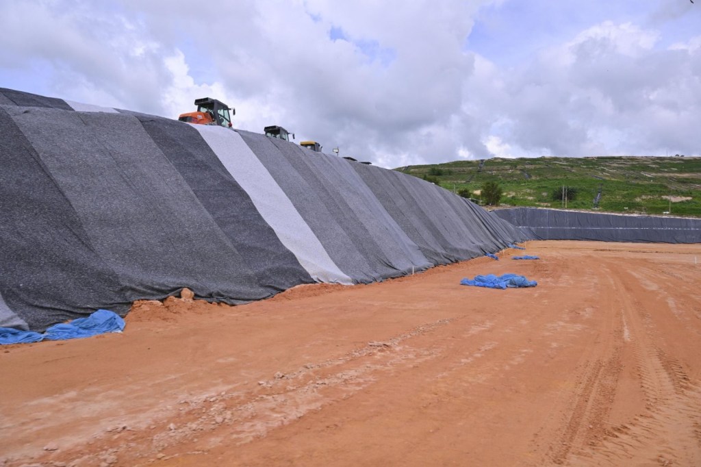 A obra conta com quatro camadas de impermeabilização, incluindo geocomposto bentonítico, geomembrana de polietileno de alta densidade, geotêxtil e argila compactada, garantindo segurança ao solo e ao lençol freático.